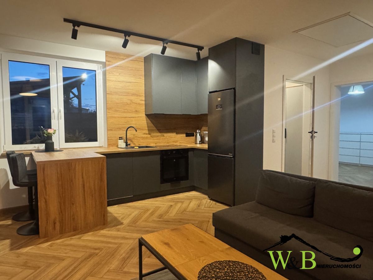 - nowoczesna zabudowa kuchenna ze sprzętem AGD (kuchenka elektryczna, zmywarka, lodówka, piekarnik)