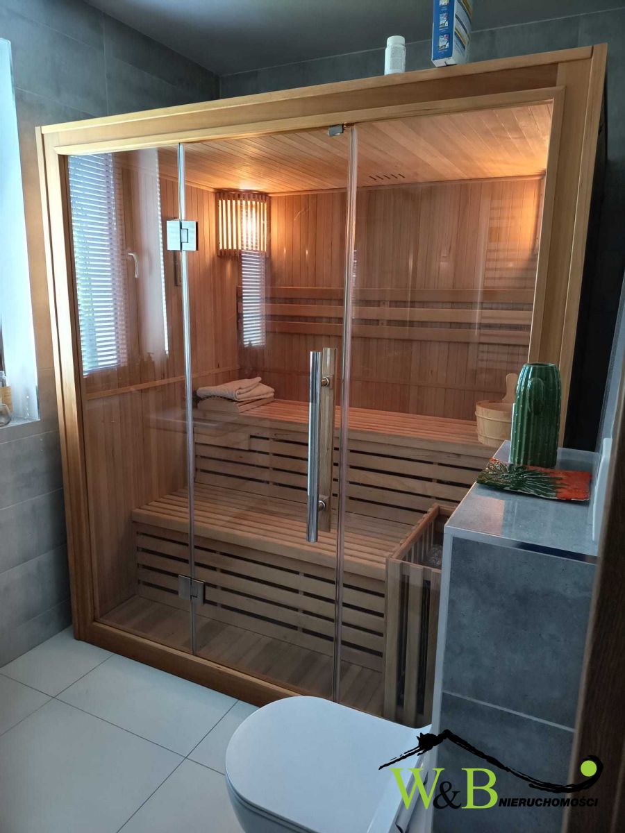 - parter: salon połączony z jadalnią i otwartą kuchnią, z wyjściem na taras, łazienka z prysznicem i sauną, gabinet,